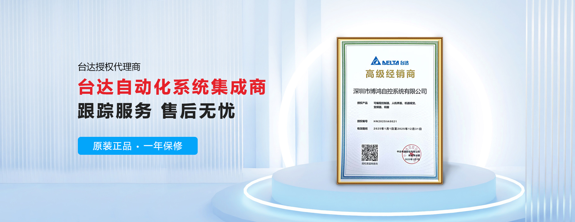 深圳市博鴻自控是臺達電子官方授權的一級代理,證書可在臺達官網查詢,從我司銷售的產品可確保全新原裝正品,一年質保,全球聯保。并享有售后全程技術支持。